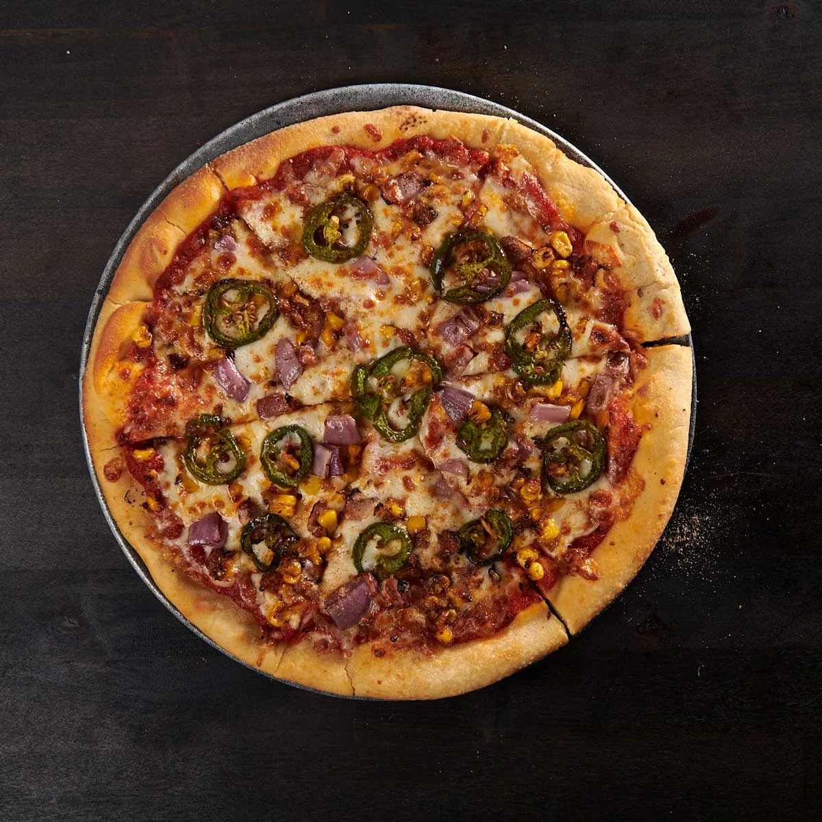 Experience the creamy, rich flavors of butter chicken on our tandoor-fired crust, complemented by tikka sauce, shredded mozzarella cheese, red onion, and a mix of peppers. A decadent choice for any meal.