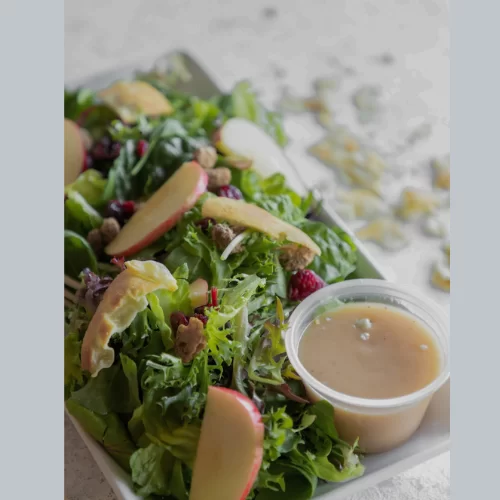 Enjoy a refreshing mix of mixed greens drizzled with an inventive apple vinaigrette. Highlighted with dried cranberries and candied pistachios, and accompanied by crisp apple slices, this salad is a celebration of taste.