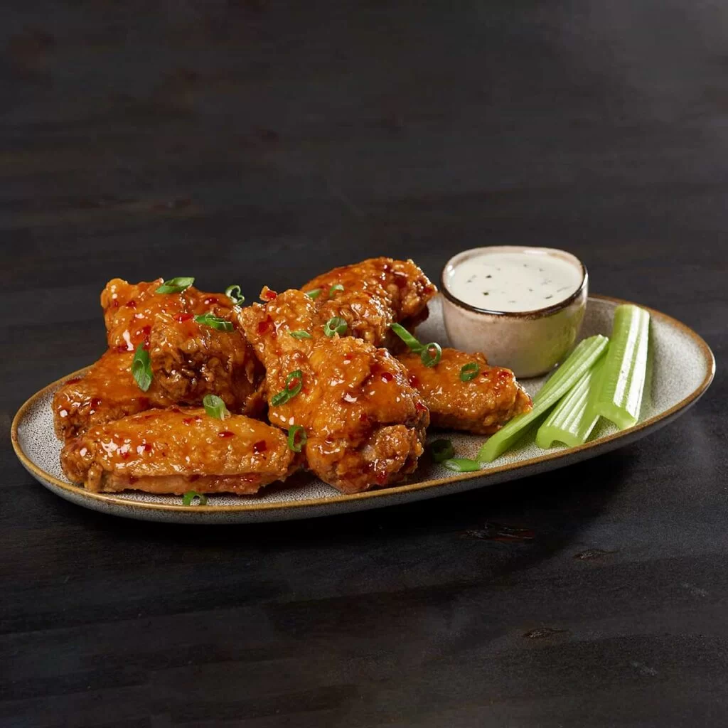made from scratch crispy chicken wings, garnished with green onions and served with celery sticks alongside a rich buttermilk dressing.