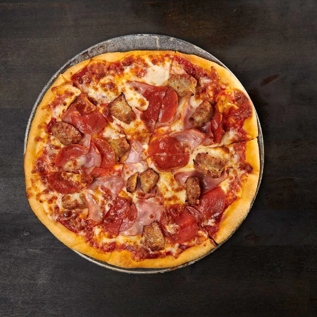 Tomato Feungreek Sauce, house 5-cheese blend, Pepperoni, Canadian Bacon, Italian Sausage