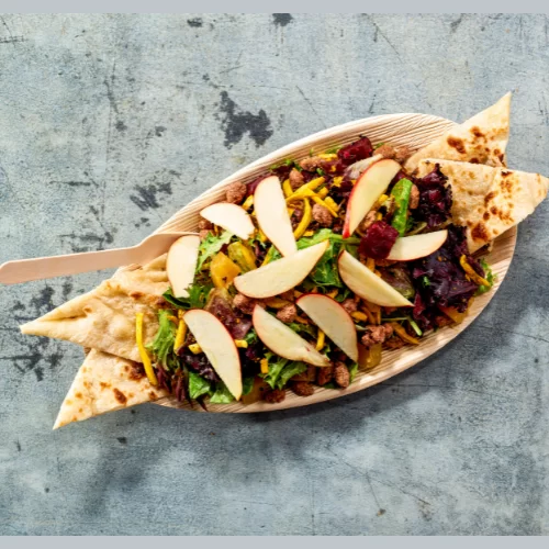 Enjoy a refreshing mix of mixed greens drizzled with an inventive apple vinaigrette. Highlighted with dried cranberries and candied pistachios, and accompanied by crisp apple slices, this salad is a celebration of taste. Topped with rich blue cheese and crunchy, chat seasoned naan chips, it’s a flavorful and satisfying choice.