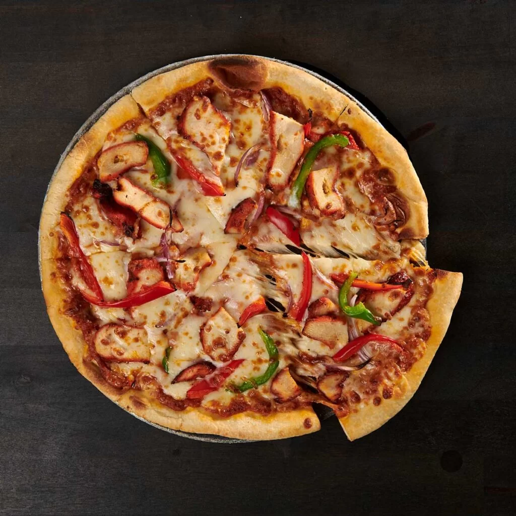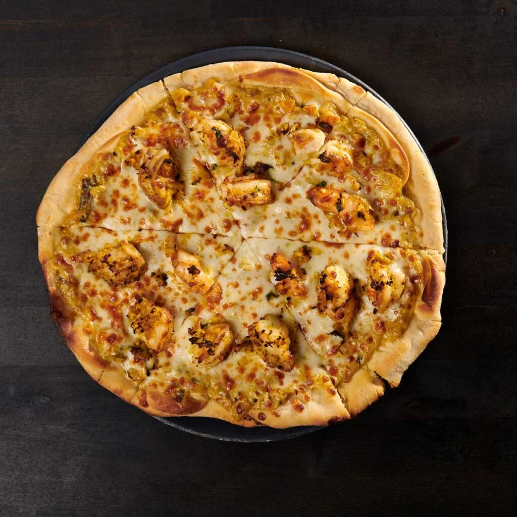 Tandoori Chicken, tikka sauce (has cashews) , house 5-cheese blend topped with onion-pepper medley (plain crust)