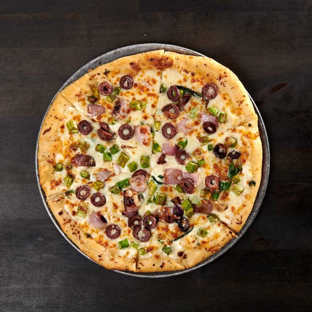 Garlic cilantro crust, garlic white sauce, 5-cheese house blend, Kalamata Olives, asparagus, spinach and onions