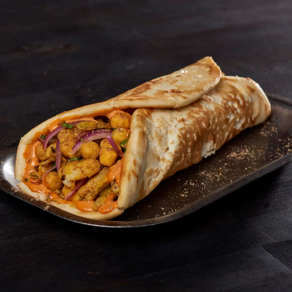 This wrap is a crunchy delight featuring a naan base, lightly brushed with ghee, and packed with a mixture of vegetables including okra, paneer, garbanzo beans, and cauliflower. The veggies are deep-fried in okra flour, tossed with chaat masala, and served with a spicy Chipotle Pepper sauce and tangy pickled onions. It’s a crispy, flavorful wrap that offers a satisfying bite.