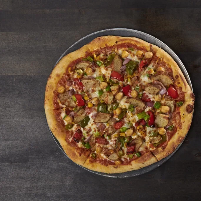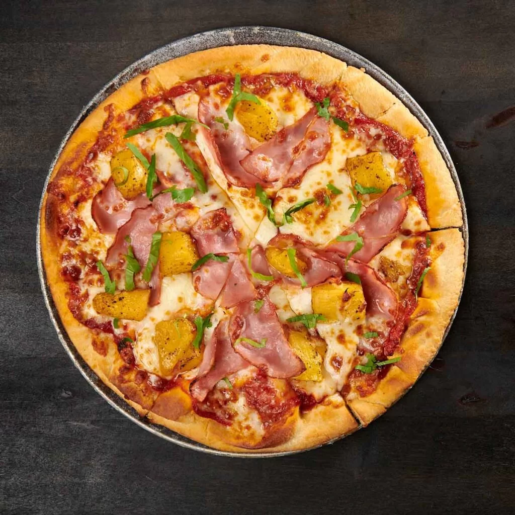 A tropical twist on a classic, our tandoor-fired crust comes brushed with ghee and layered with tomato-fenugreek sauce. Topped with slices of Canadian bacon and sweet, roasted pineapple, then finished with a rich covering of 5-cheese house blend. After baking, this delightful pizza is garnished with fresh cilantro, adding a burst of freshness to each bite.