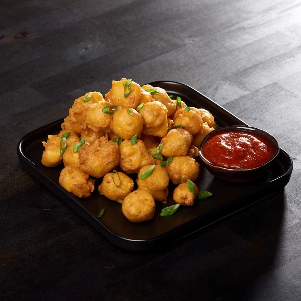 Indulge in marinated paneer cubes, encased in a crispy beer batter, and served with our spicy red-hot tomato sauce. Garnished with green onions, these poppers are a bold fusion of flavors that are sure to please.