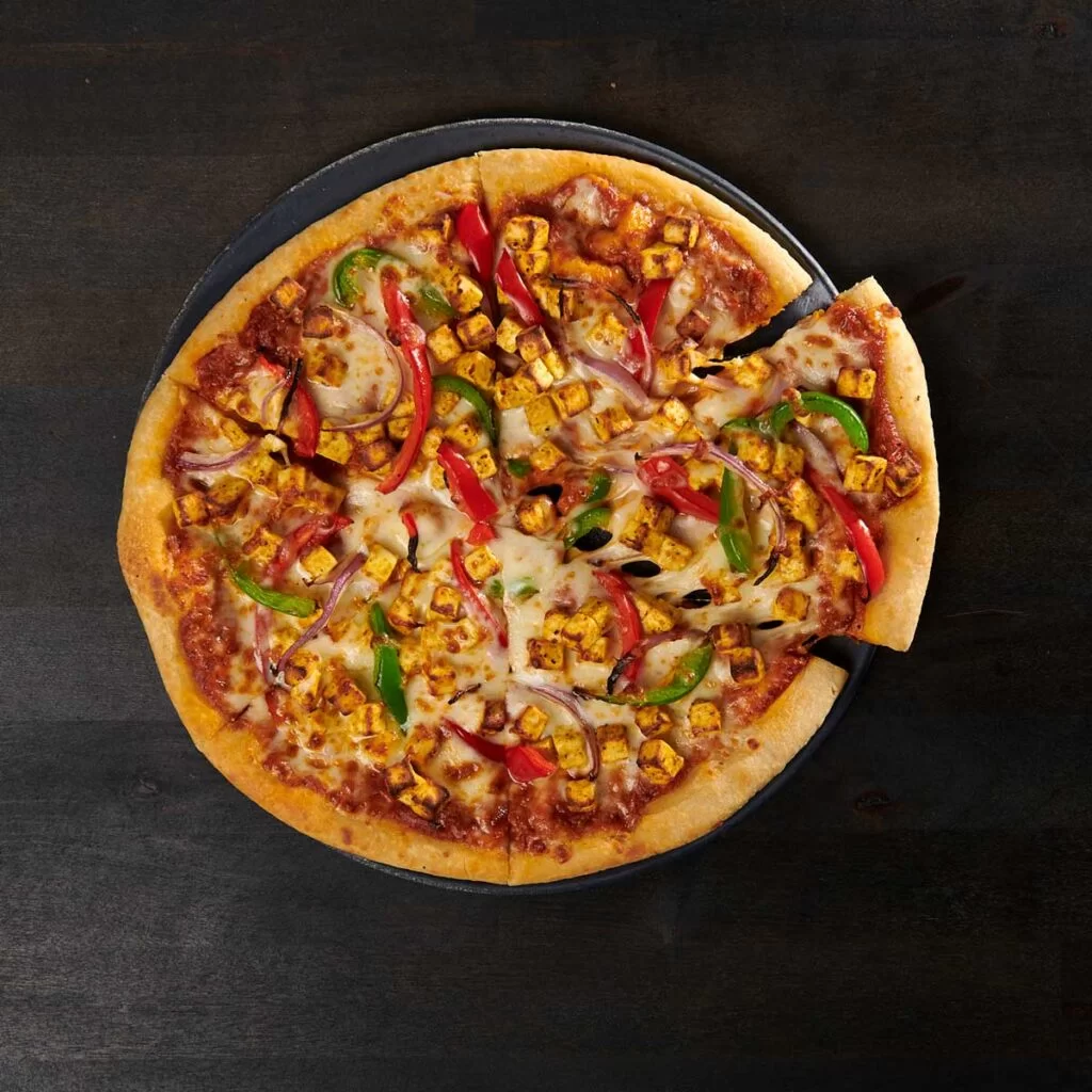 Firm non-melting cheese, tikka sauce, house 5-cheese blend topped with onion-pepper medley (plain crust)