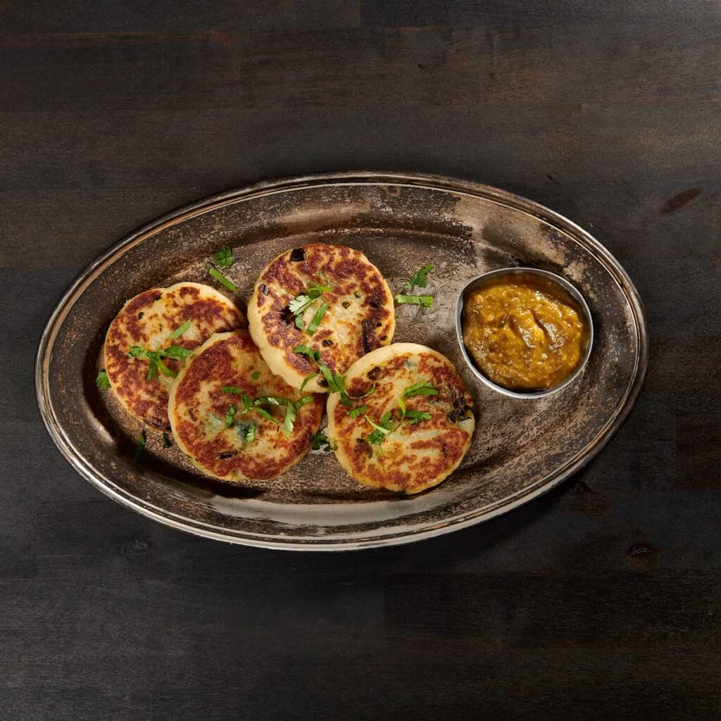 Delight in our stuffed potato cakes, each a perfect blend of comforting flavors, served with a tangy raisin-ginger sauce and freshly garnished with cilantro. These cakes offer a satisfying texture and a burst of flavor with every forkful.