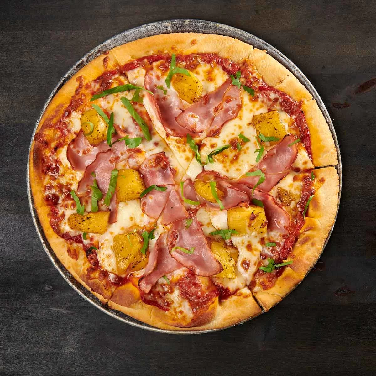 A tropical twist on a classic, our tandoor-fired crust comes brushed with ghee and layered with tomato-fenugreek sauce. Topped with slices of Canadian bacon and sweet, roasted pineapple, then finished with a rich covering of shredded mozzarella cheese. After baking, this delightful pizza is garnished with fresh cilantro, adding a burst of freshness to each bite.